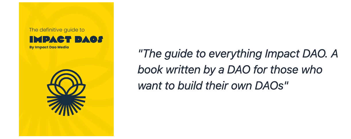 Wherever you come from, or whatever causes you care about, there is likely already an ImapctDAO out there for you. If you want to understand more about the space or get more invovled, the definitive guide to Impact DAOs by the amazing Deepa Rocks and ImpactDAO Media is out now. If you’re a complete newbie to the space, or a seasoned Web3 builder, this free online book has insights for all: