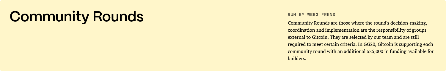 Additionally to the program rounds, Gitcoin facilitates Community Rounds—managed externally yet meeting Gitcoin's criteria—with each round receiving an extra $25,000 in support. Notable rounds include the CCN Climate Solutions Round, which aims to foster sustainable blockchain-enabled climate solutions; the Hypercerts Ecosystem Round for projects building on the hypercert protocol; the Token Engineering Commons Round, which supports innovative token engineering projects; and the OpenCivics Consortium Round, funding civic impact initiatives. These efforts collectively advance strategic grant distribution and robust community support across diverse areas of impact.