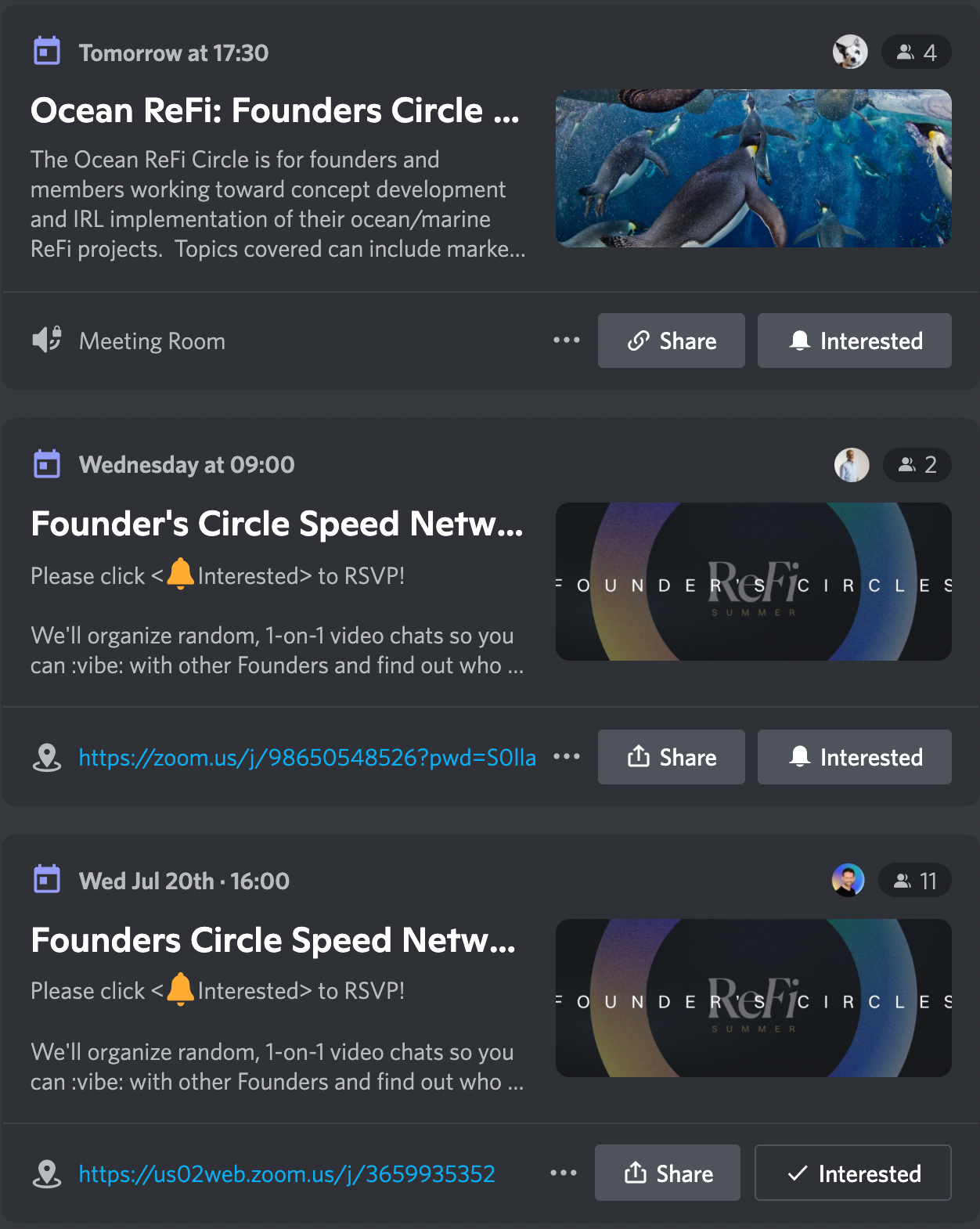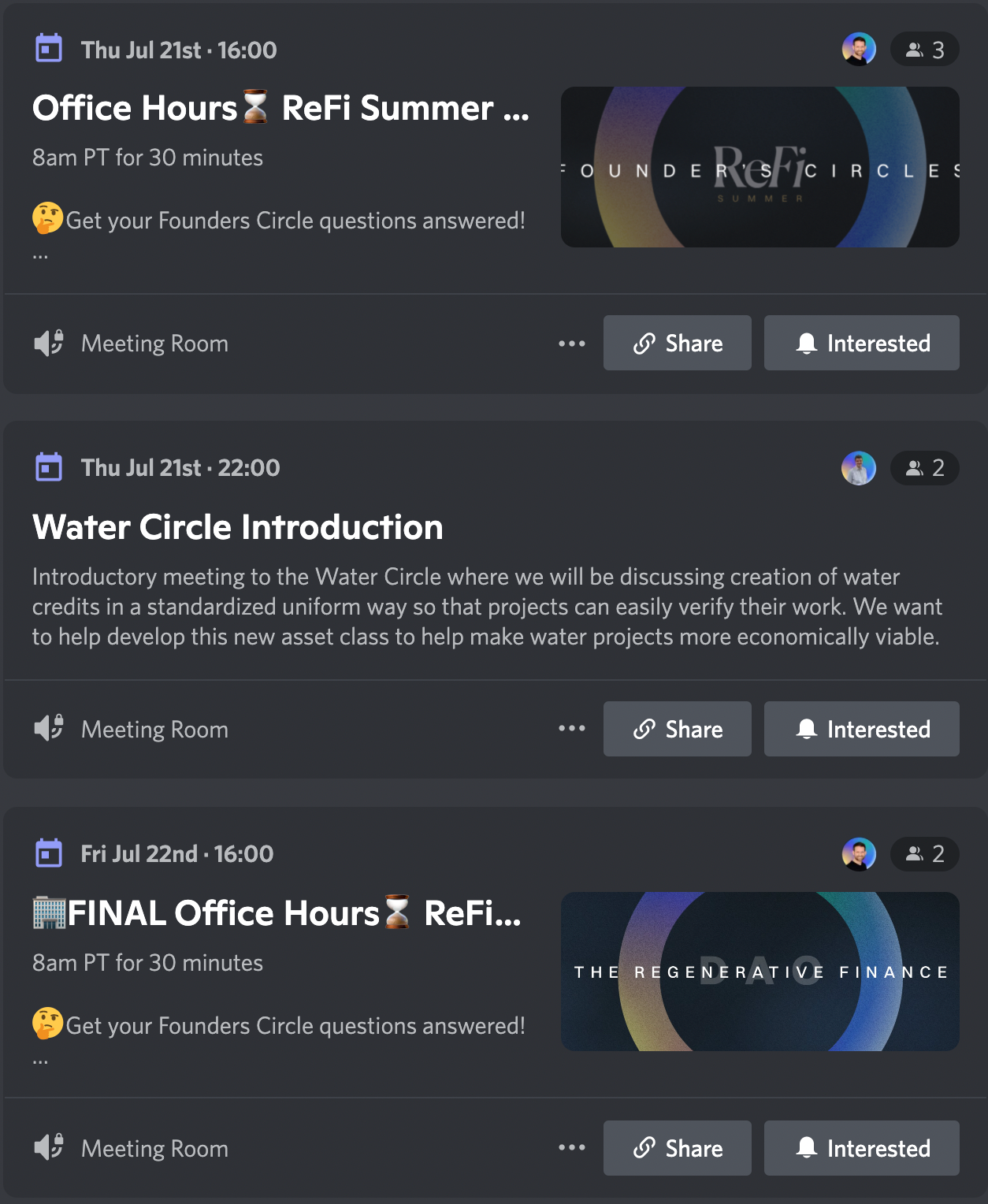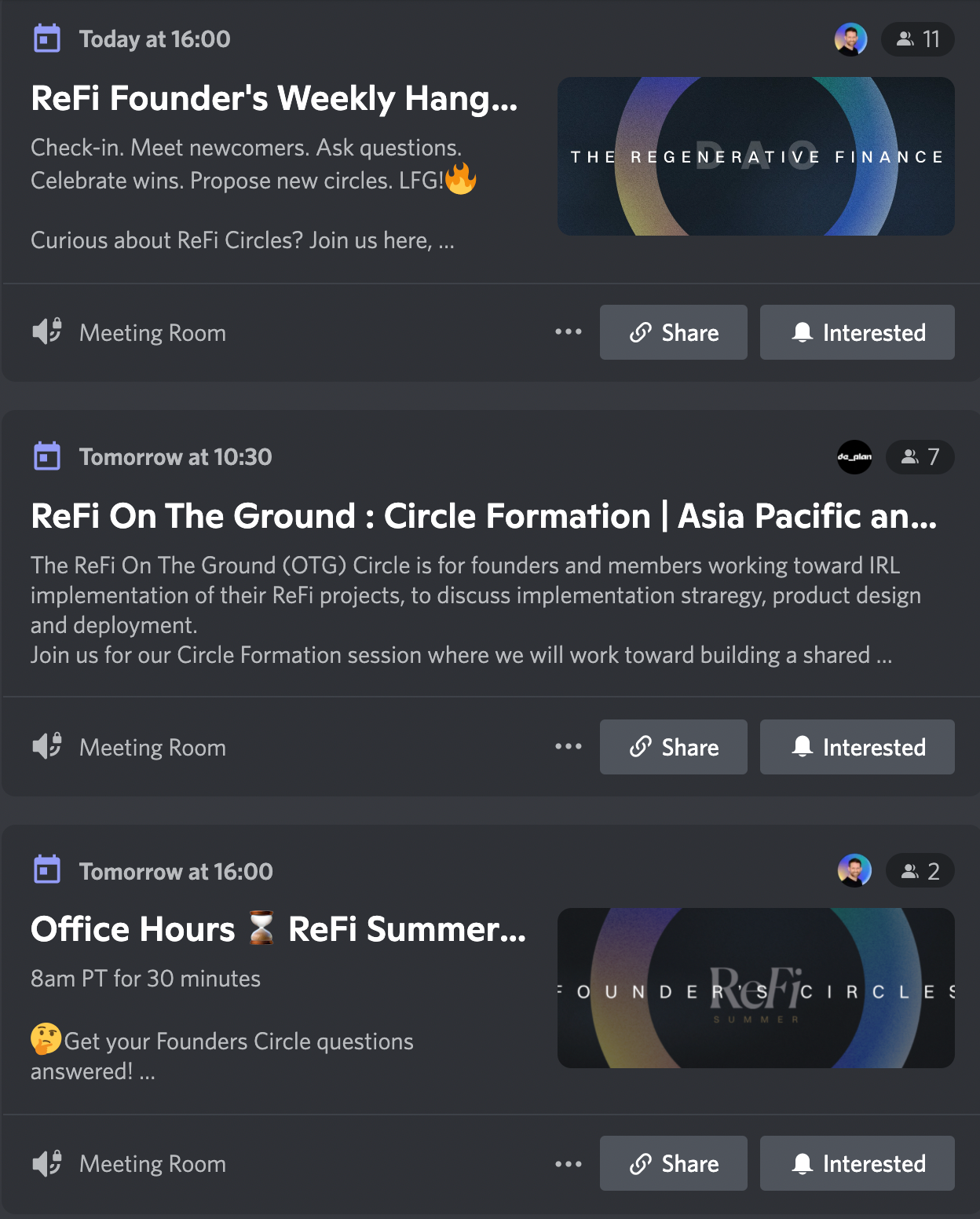 Here are all the events currently scheduled around Founder's Circles in Discord this week: