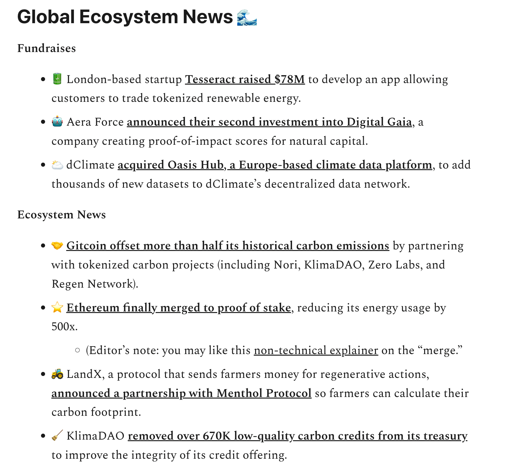 Our friends at Aera Force are building a Venture DAO focused on web3 climate projects. They also do a great bi-weekly newsletter. It's condensed and leans towards the investor side of the equation.