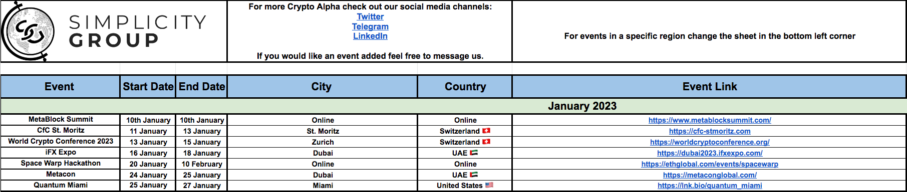 Or for more Crypto orientated events, have a look at this sheet by Simplicity Group:
