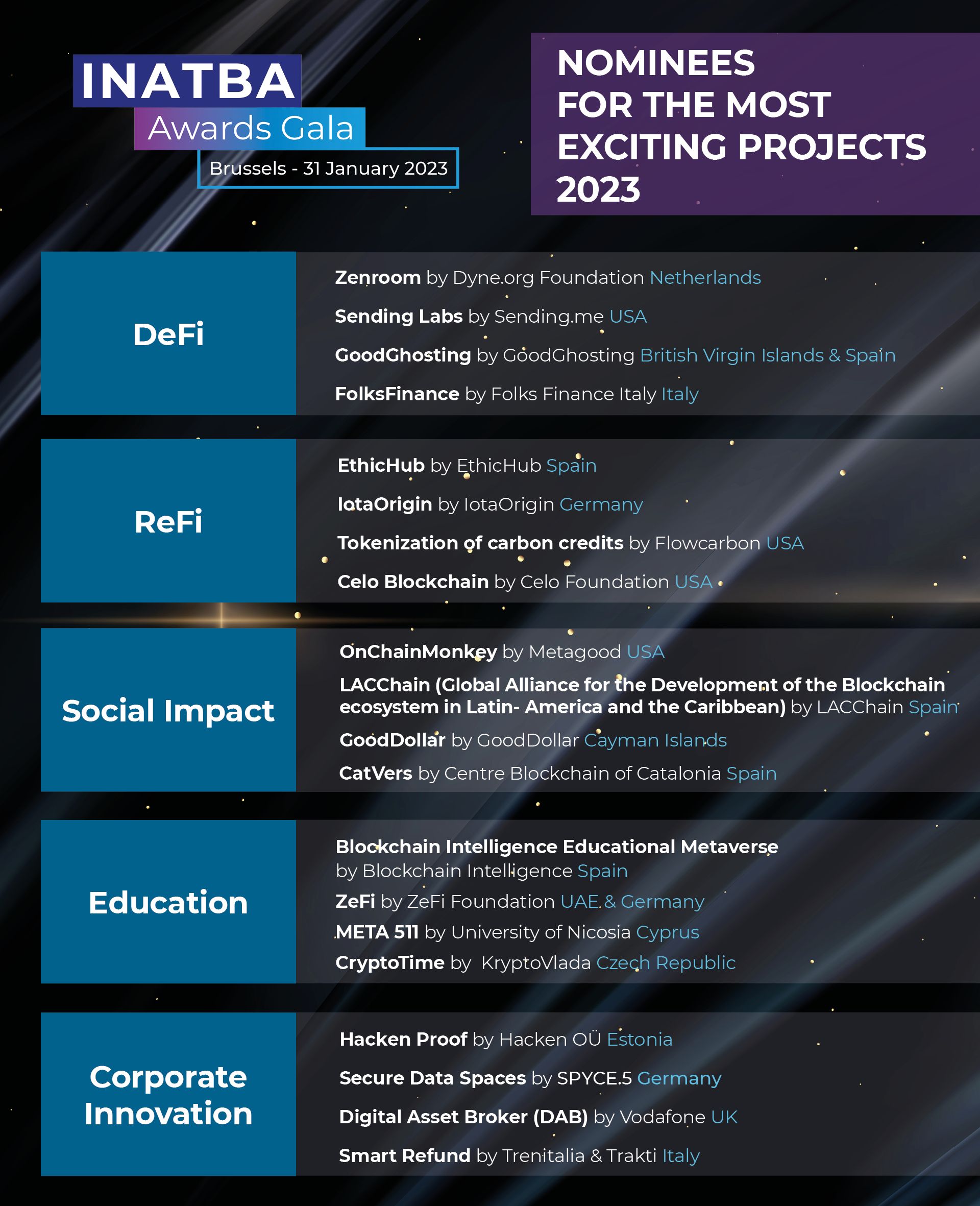 INATBA announce the top 4 nominees for the INATBA Award for the Most Exciting Project of 2023 under the following sub-categories: DeFi, ReFi, Social Innovation, Education, and Corporate Innovation.
