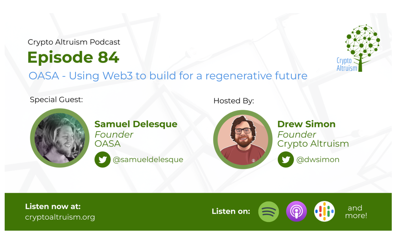 Samuel Delesque of OASA joins Drew Simon in the latest Crypto Altruism podcast to discuss the use of Web3 tools like DAOs in community-driven conservation and regeneration projects, as well as the potential of regenerative finance for building a more sustainable and equitable world.