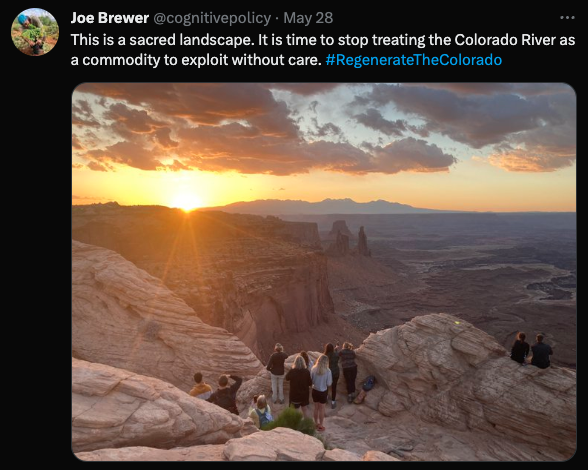 Joe Brewer is on a mission to regenerate the entire Colorado River Basin. Follow along his journey with the hashtag #RegenerateTheColorado to see the web of relationships he is cultivating along a massive geographic area in service of restoring the entire watershed.