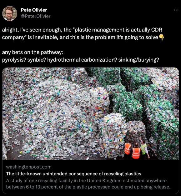 Pete Olivier raises an important question about plastics and carbon removal. The article he cites references a study that suggests recycling processes may be exacerbating microplastic pollution in air, soil, and water.