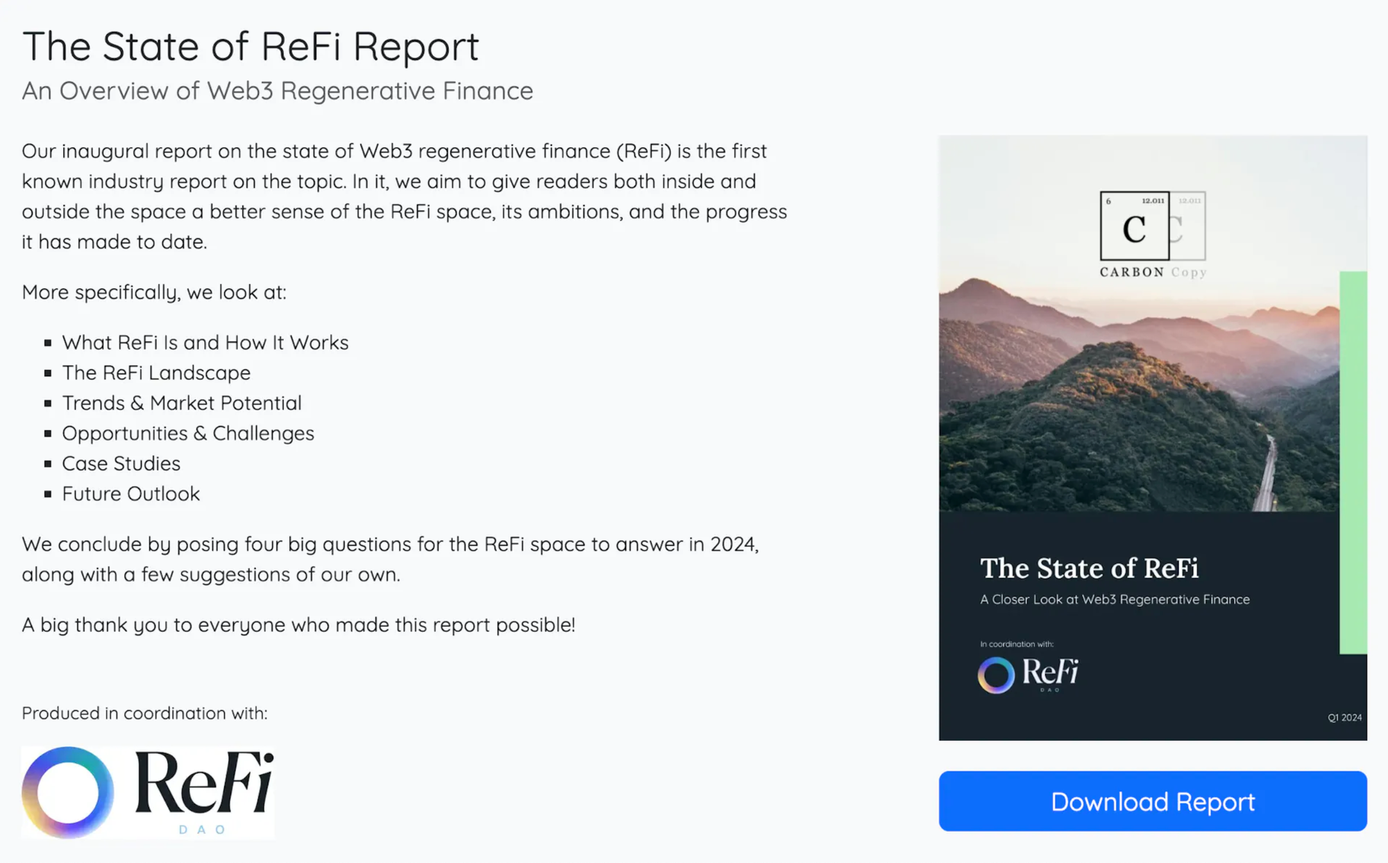 CARBON Copy and ReFi DAO recently joined forces to publish The State of ReFi Report, giving an overview of existing ReFi efforts as well as the key narratives in the space as of 2024.
