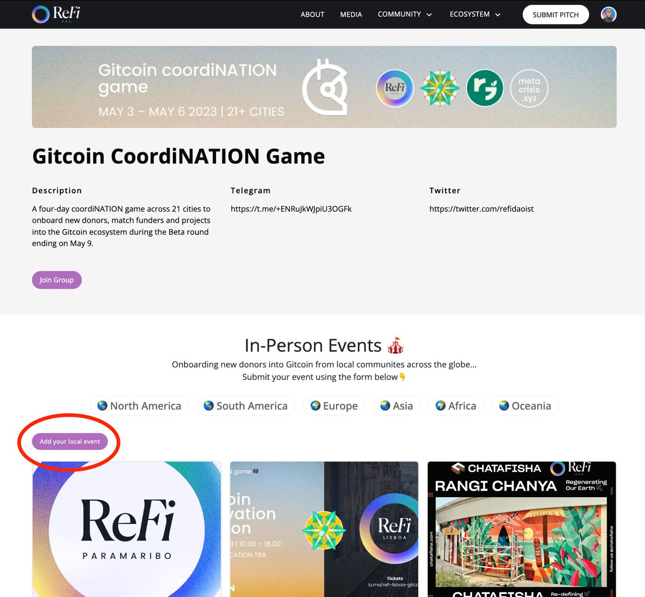 If you're a local web3 community inspired by the power of Gitcoin's open-source funding legos, you should host an event! All you need to do is find a venue, create an event on lu.ma or Eventbrite and submit it by clicking on "add your local event" (see picture below).