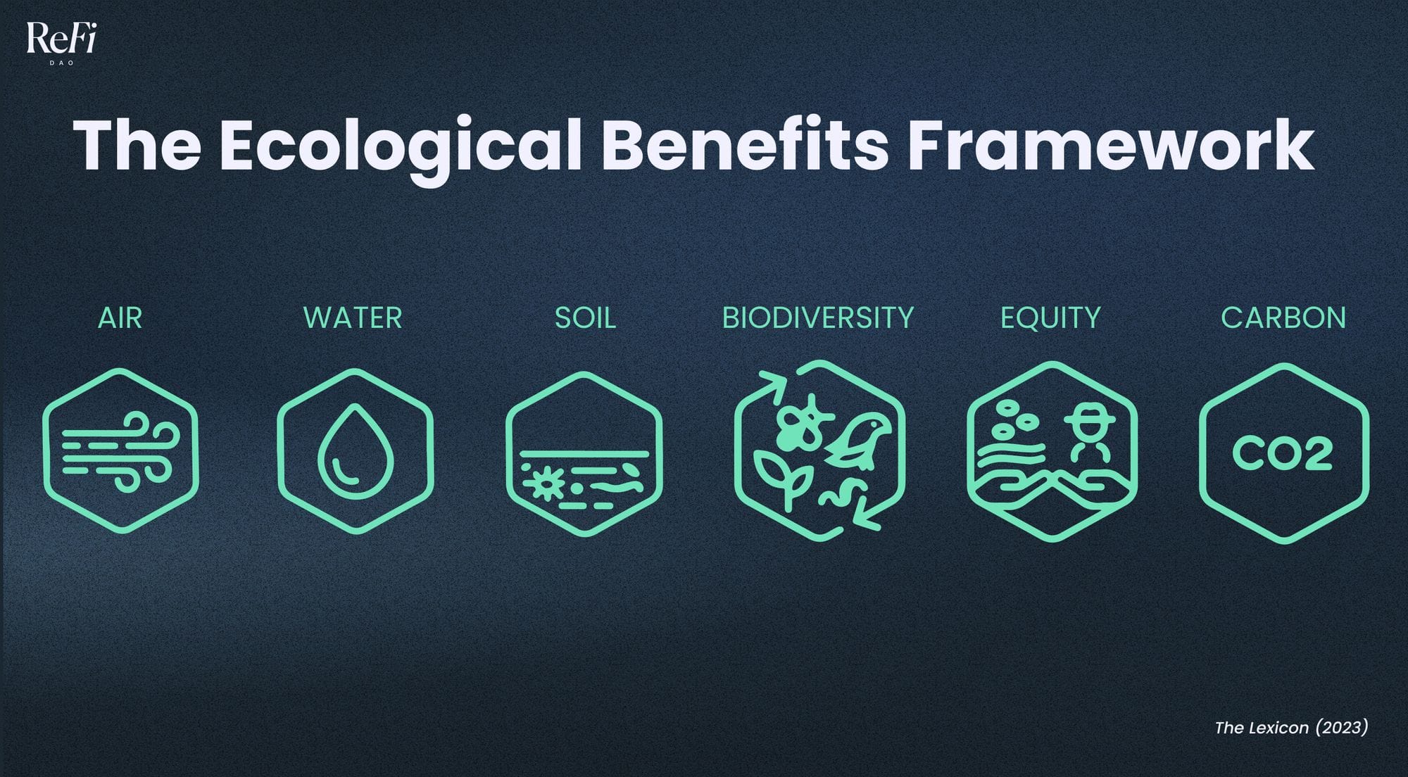 Additionally, the Ecological Benefits Framework ("EBF"), developed by The Lexicon in collaboration with over 200 organizations, integrates six elemental components to showcase the potential impact of projects within this movement: carbon, biodiversity, water, air, soil, equity.