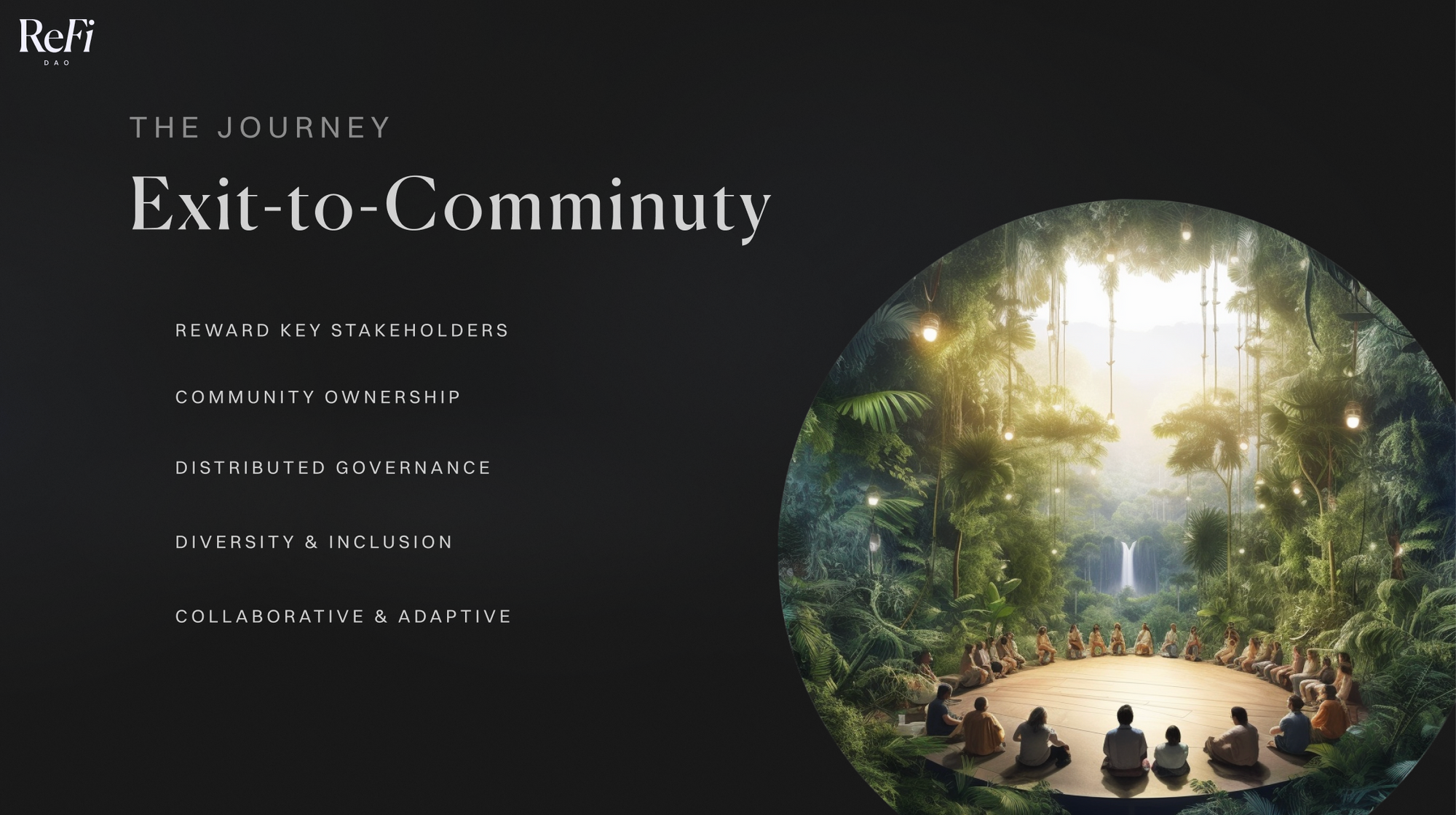 With this is mind, ReFi DAO is seeking to embark on a 12 to 24 months journey towards 'Exit-To-Community' where ownership and governance will be distributed to key community members and contributors. This strategy seeks to decentralize wealth and voice across the network rather than concentrating it in a select few, and aims to ensure that the organization is co-owned and co-governed by the community that fuels it in a way that promotes inclusivity, dynamism, and enhances collective capacity.