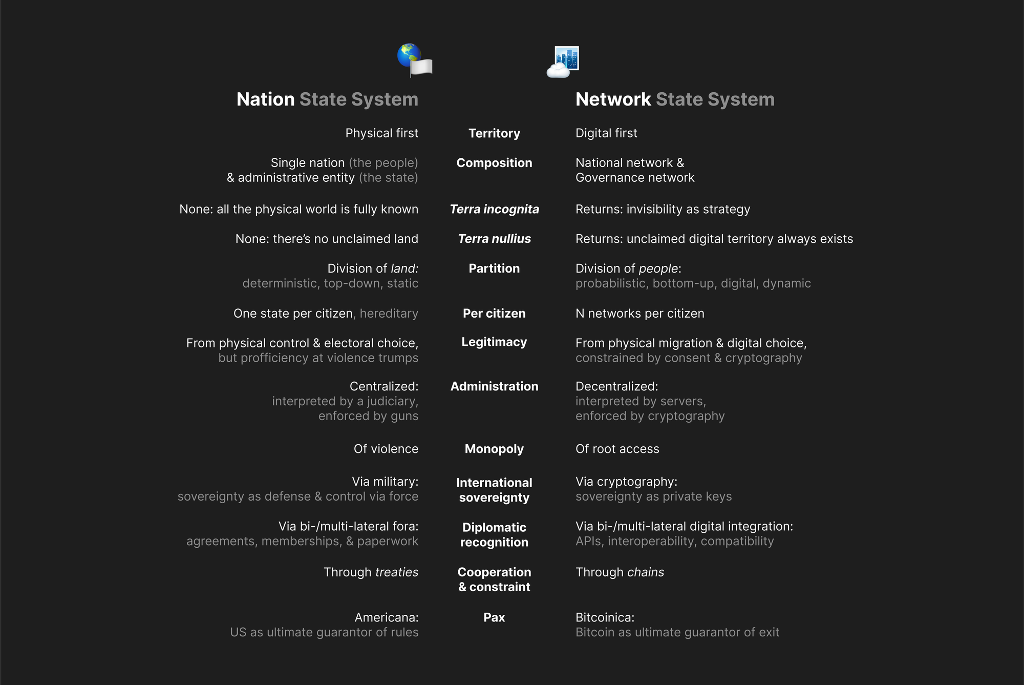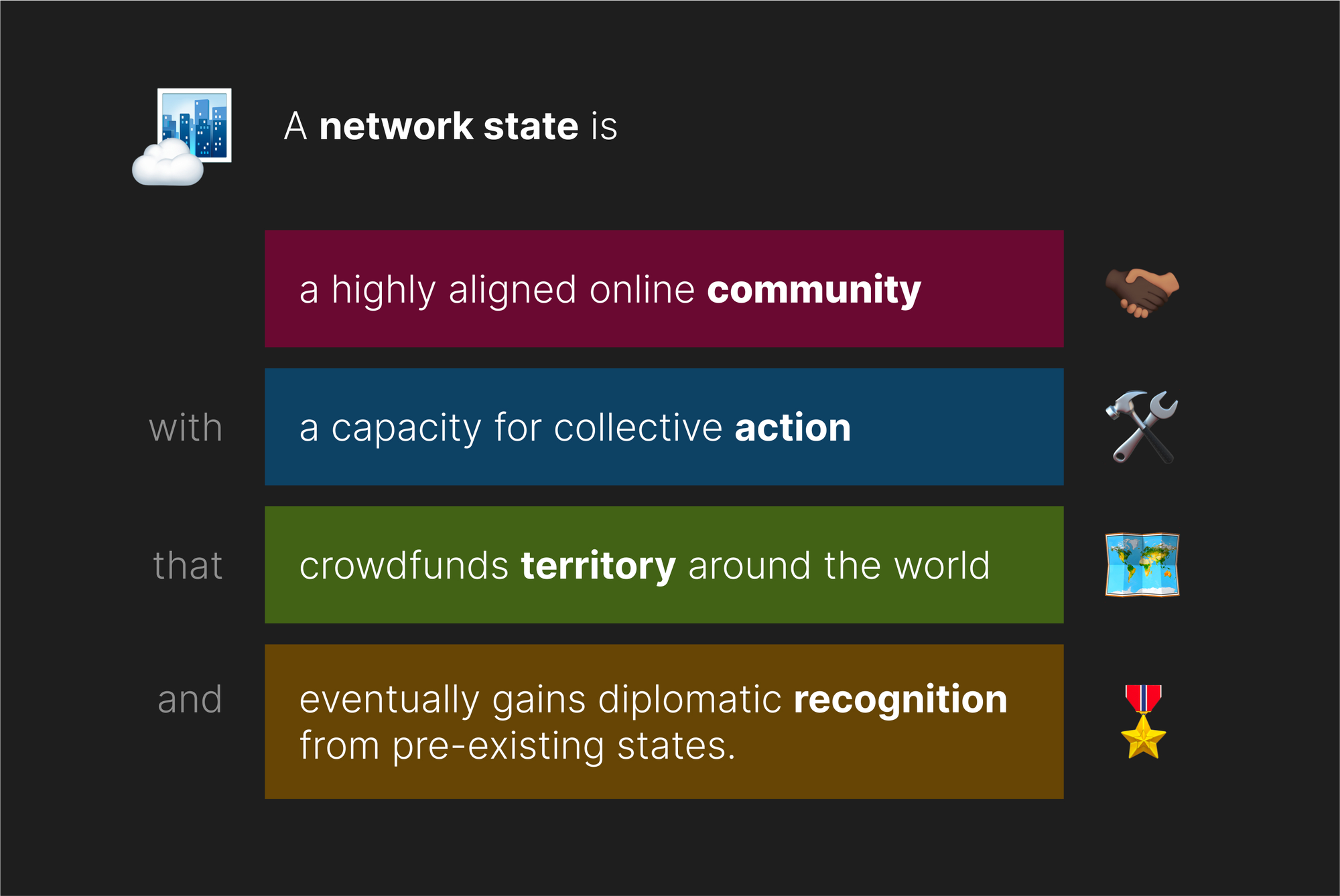 As defined by Balaji, he characterises a network state as the next evolution of nation-states. He envisions them starting with the formation of highly-aligned online community that takes root around a strong shared proposition or 'moral innovation'. Subsequently the community goes on to acquire land or 'territory' in various locations, acting more like a decentralized network than a contiguous piece of land. The idea is based on the convergence of digital platforms and political entities that evolve from online communities based on shared propositions into actual physical states.
